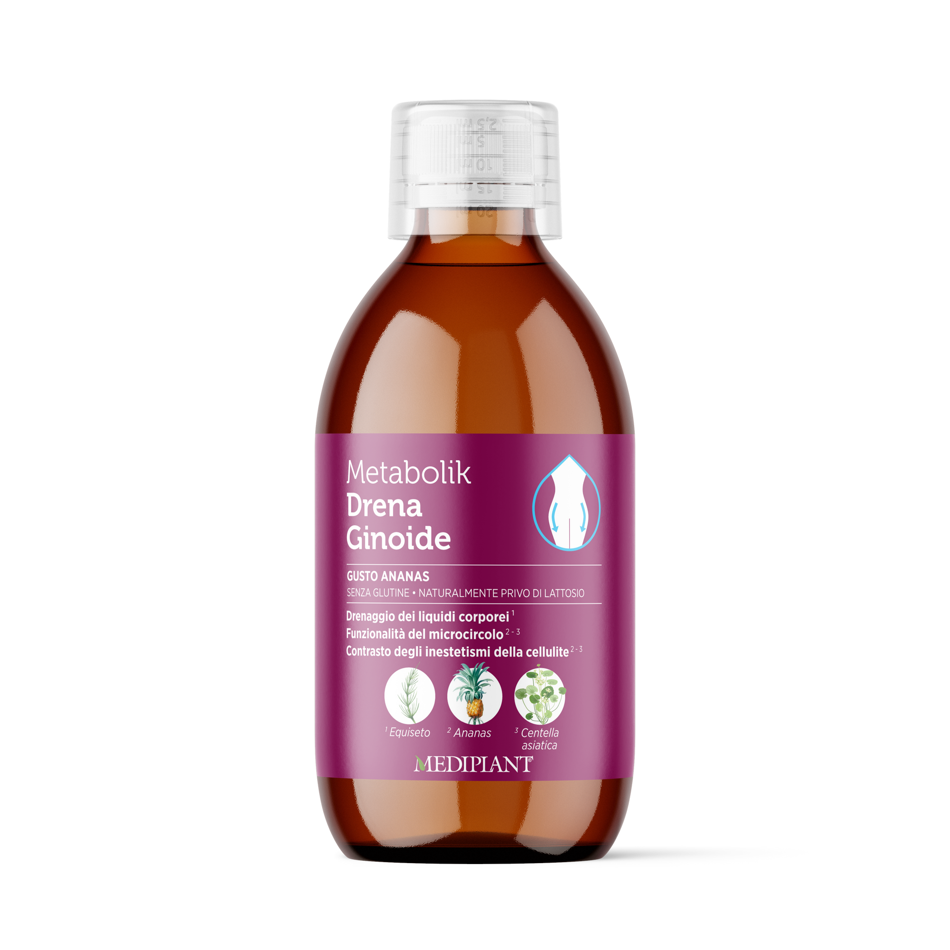 Metabolik Drena Ginoide è un integratore alimentare a base di estratti vegetali di Equiseto, utile per il drenaggio dei liquidi corporei, Centella asiatica e Ananas che favoriscono la funzionalità del microcircolo e contrastano gli inestetismi della cellulite.